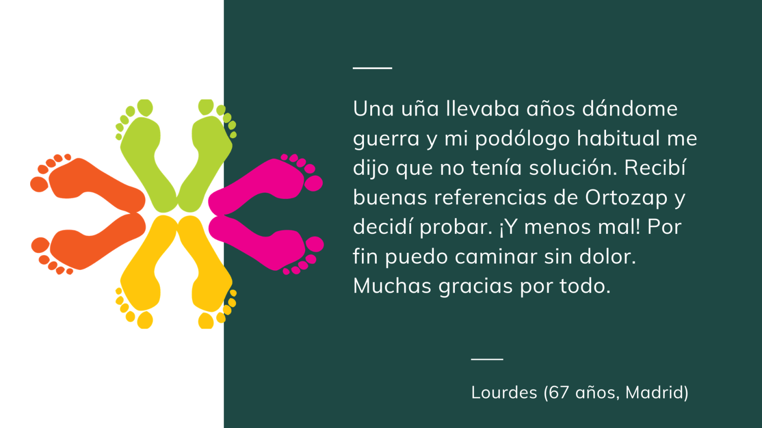 Una uña llevaba años dándome guerra y mi podólogo habitual me dijo que no tenía solución. Recibí buenas referencias de Ortozap y decidí probar. ¡Y menos mal! Por fin puedo caminar sin dolor. Muchas gracias por todo. Lourdes (69 años, Madrid)